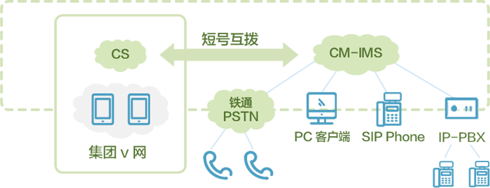 CS 域用户和 IMS 域用户可组成跨省、跨域、多终端接入的 VPMN 群,享受群内用户的长短号互拨以及资费优惠等 V 网业务特征。