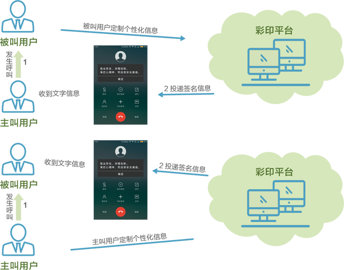 从业务形式角度,彩印分为被叫彩印和主叫彩印。被叫彩印:被叫用户设置彩印信息,该用户被呼叫时,由系统自动把被叫用户预先设定好的彩印信息推送到主叫手机上,使主叫用户看到彩印信息。用户体验类似彩铃,主叫观看被叫设置的文字信息,可视化感受。主叫彩印:主叫用户设置彩印信息。在呼叫其他用户时,由系统自动把主叫用户预先设定好的彩印信息推送到被叫手机上,可提供类似名片展示的功能,方便被叫对主叫有提前、详细的了解。