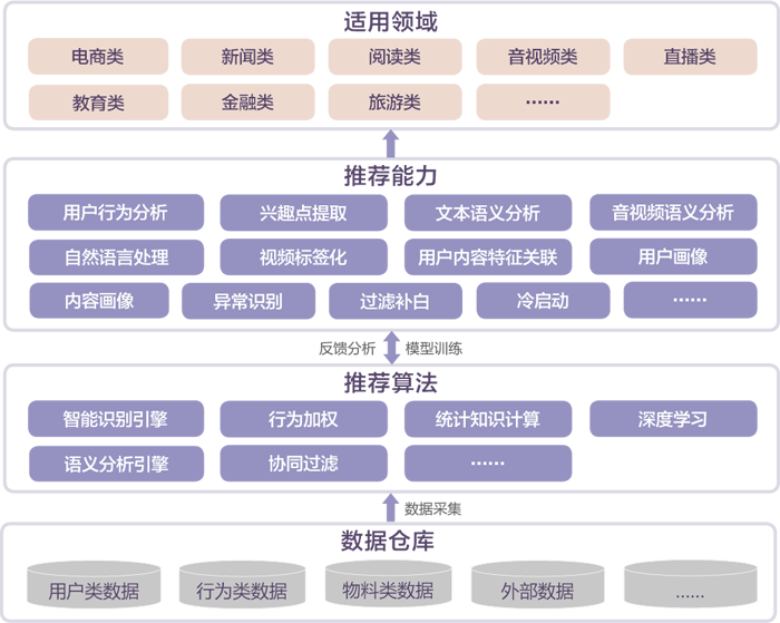 基于 AI 的智能推荐产品是通过采集多方结构化和非结构化数据,运用语义分析、智能识别、深度学习等机器学习算法,具备用户行为分析、音视频语义分析、视频标签化、自然语言处理、异常识别等推荐能力,用以支撑电商、新闻、阅读、音视频、直播、教育、金融、旅游等多行业的 AI 智能推荐服务。