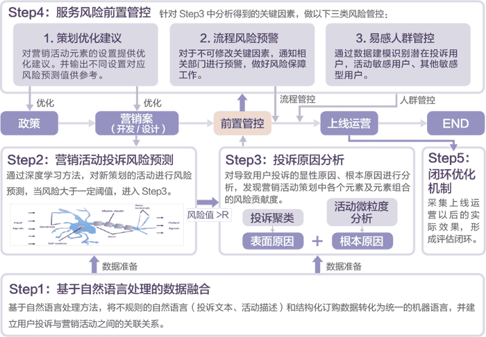 如何预估营销活动的服务风险并提前做出应对举措,是一件很有挑战性的工作。就当前营销活动而言,从策划到执行,本身自成体系,缺乏从服务、投诉的角度对活动进行评估、优化,例如营销活动包括目标用户选取,流程规则设置和营销执行等过程,其中的每一项都可能会影响到客户,但是目前是无法准确判断是哪个环节引起了用户投诉。而对投诉处理而言,目前主要以被动核查解决为主,缺乏预见性的、前置的投诉风险控制解决方案,而收集到的投诉无法对如何配置营销活动提供建议。投诉风险前置产品通过 AI 及大数据技术,加入风险前置管控模块,对营销活动上线前的全流程进行智能优化,在营销活动执行前提前预测分析会带来的投诉风险,最终实现营销案政策的下发、营销案的设计以及营销案的上线运行等流程中,增加全流程的风险管控及优化建议。