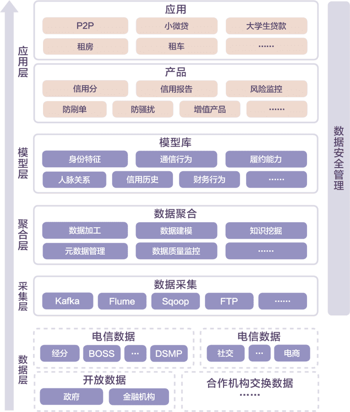 金融征信产品依托于电信运营商的大数据,构建个人用户信用积分评价体系,提供互联网征信金融产品;在为金融服务商信用评估提供决策依据的同时,拓展运营商信用体系生态圈,结合第三方企业数据,分析企业经营情况,为银行、金融机构、车辆房屋租赁企业等提供数据支撑。