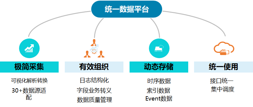 解决运维数据分散、缺乏有效组织,故障事件定位难等问题,统一数据平台支持30+数据源适配,并且对采集到的数据进行统一规范整理,有效组织,采用时序数据、索引数据、Event数据等方式进行动态存储,供应用统一调用。