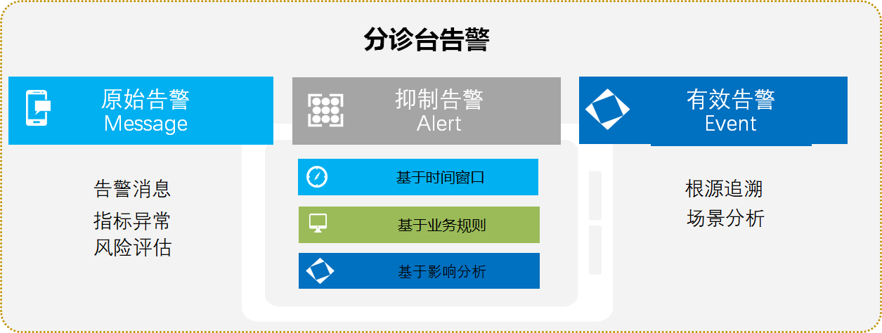 分诊台就是全科医生,对不同来源的告警进行统一处理,通过告警合并、收敛、朔源等操作,提炼有效告警,并通过告警分诊台将告警标注不同的颜色,不同级别,触发不同的处理角色和流程。