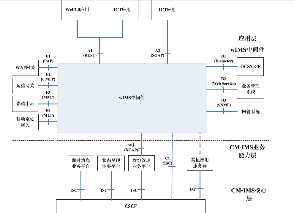•连接各种网络业务能力平台:南向采用各类标准化接口连接各网络业务能力平台,实现对于CM-IMS和2G/TD通信能力的调用;
