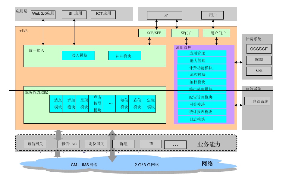 网管模块:提供给中国移动网管系统SNMP接口,实现网管系统对wIMS中间件进行维护、配置与管理;