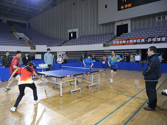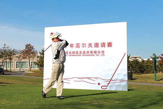 2010年4月10日清晨,北京清河湾高尔夫球场上处处可见有着EB的标识球帽、提包、背板、横幅……“东信北邮高尔夫邀请赛”开赛啦!下午时许,“东信北邮乒乓球邀请赛”于奥体中心体育馆展开激烈的对决,同期北京北辰洲际酒店正在进行着高规格的“东信北邮桥牌邀请赛”。