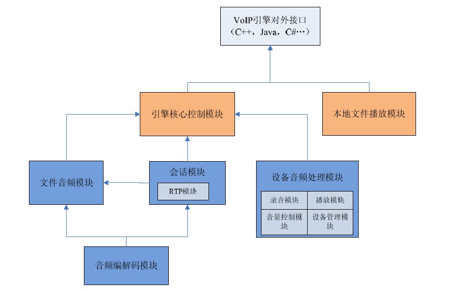 5)设备音频处理模块:包括音频的录制、播放,音频设备的管理,以及音量的控制等。待播放的数据从引擎核心控制模块中获取,已录制的数据也直接交给引擎核心控制模块进行处理。