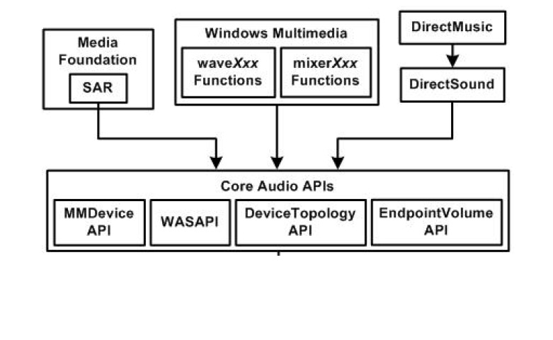Vista和Windows 7在音频播放录制方面提出了一套全新的概念和架构。在设备上,微软取消了声卡的概念,取而代之的是播放设备、麦克风和线路输入设备。Vista和Windows 7包含了多套应用层音频API,有的是老版本Windows的API,如WaveXxx和DirectSound,有的是新的,如Media Foundation中的SAR。在这些应用层之下,微软还开放了一套层次较低的公共API——Core Audio APIs[4],用于一些实时性较高或者对设备控制有较高需求的应用,如图2所示。