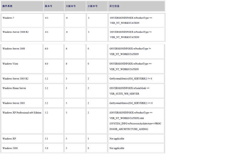 通过操作系统提供的系统API获取当前操作系统的版本,并根据相应的版本,初始化对应的设备音频处理模块。辨别操作系统版本的API为GetVersionEx,该API支持的最低版本的操作系统为Windows 2000,具体用法详见微软MSDN帮助文档[4]。常见Windows操作系统版本如表1: