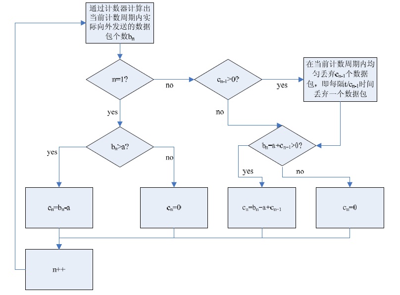 Step3:若cn-1>0,则在当前计数周期内均匀丢弃cn-1个数据包,即每隔t/cn-1时间丢弃1个数据包。转Step4。