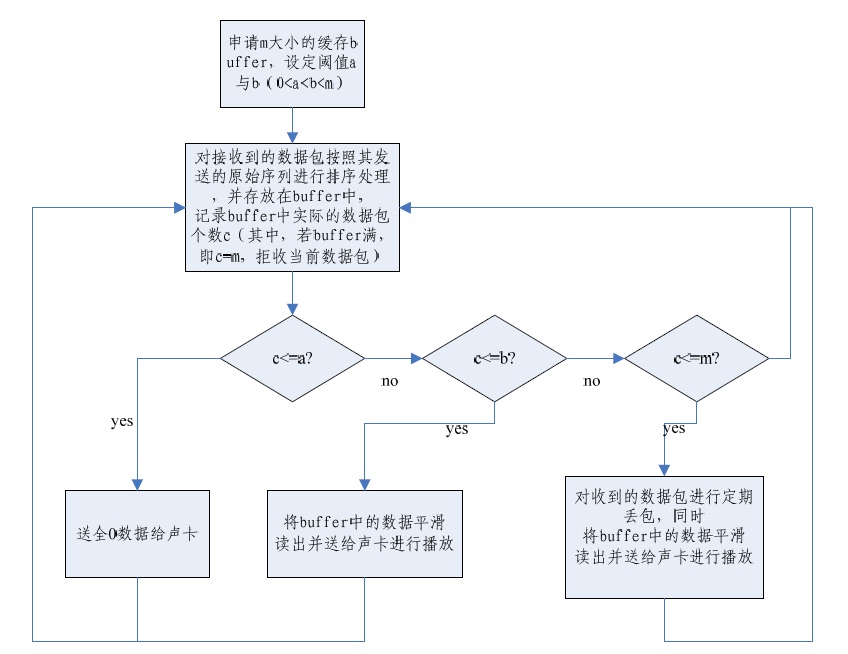 在接收端,需要平滑地读取数据包。这就需要一个缓存,来存放并整理刚来到的数据包,在其达到一定数量时,再取出相应数据流畅地播放。如若没有缓存,来一数据就开始播放,极有可能出现语音播放不流畅,先发送的数据包也有可能后到达,这样的播放就会出现逻辑混乱的错误。