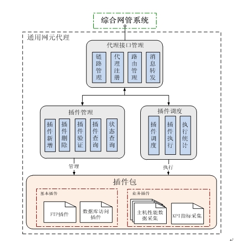 代理接口模块实现与综合网管系统控制中心的通信、消息转发等功能;插件管理模块实现系统对插件的管理功能,包括插件的新增、删除、验证、已安装插件信息查询、插件运行状态查询等功能;插件调度模块实现了插件自动安装升级、网管数据采集等通用网元代理的核心功能。