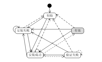 根据实际情况,插件在通用网元代理侧的状态可划分为五种:初始、安装失败、安装成功、验证失败、有效。插件首次安装状态为初始,之后状态通过安装、卸载、验证三种操作进行迁移。插件状态之间的转换关系如图 4所示,其中实线为安装操作,虚线为卸载操作,点划线为验证操作。