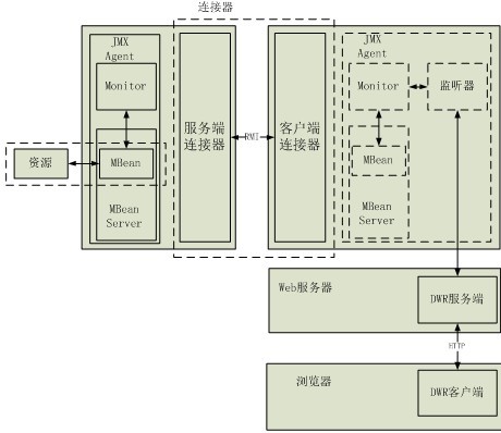 JMX(Java Management Extensions)是一个为应用程序植入管理功能的框架,可以在Java 应用程序中使用JMX框架实现管理。JMX 定义了一种基于Java事件模型的通知机制,可以方便的实现对资源的监控。采用DWR框架,结合JMX的通知机制,实现基于Web的监控系统,可以较好的满足监控实时性需求。