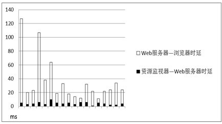 从新数据产生到浏览器接收到数据更新通知所产生的时间间隔主要分布在10ms-40ms之间,平均为36ms;主要的时延在Web服务器到浏览器之间,平均31ms。时延差异主要原因在于RMI和HTTP的性能差异,RMI在响应时间和资源利用率等方面均优于HTTP[7]。