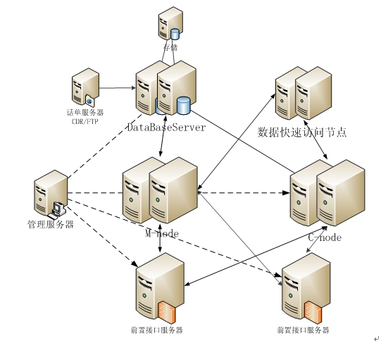 OMP鉴权中心采用J2EE(Java 2 Platform Enterprise Edition)三层架构设计,分为表现层、业务逻辑层和持久化层[5],从物理结构上分大体包括接口服务器,呼叫节点、管理节点及数据库服务器(DB中间件、存储、话单服务器和数据快速访问节点)。OMP鉴权子系统部署结构如图1所示。