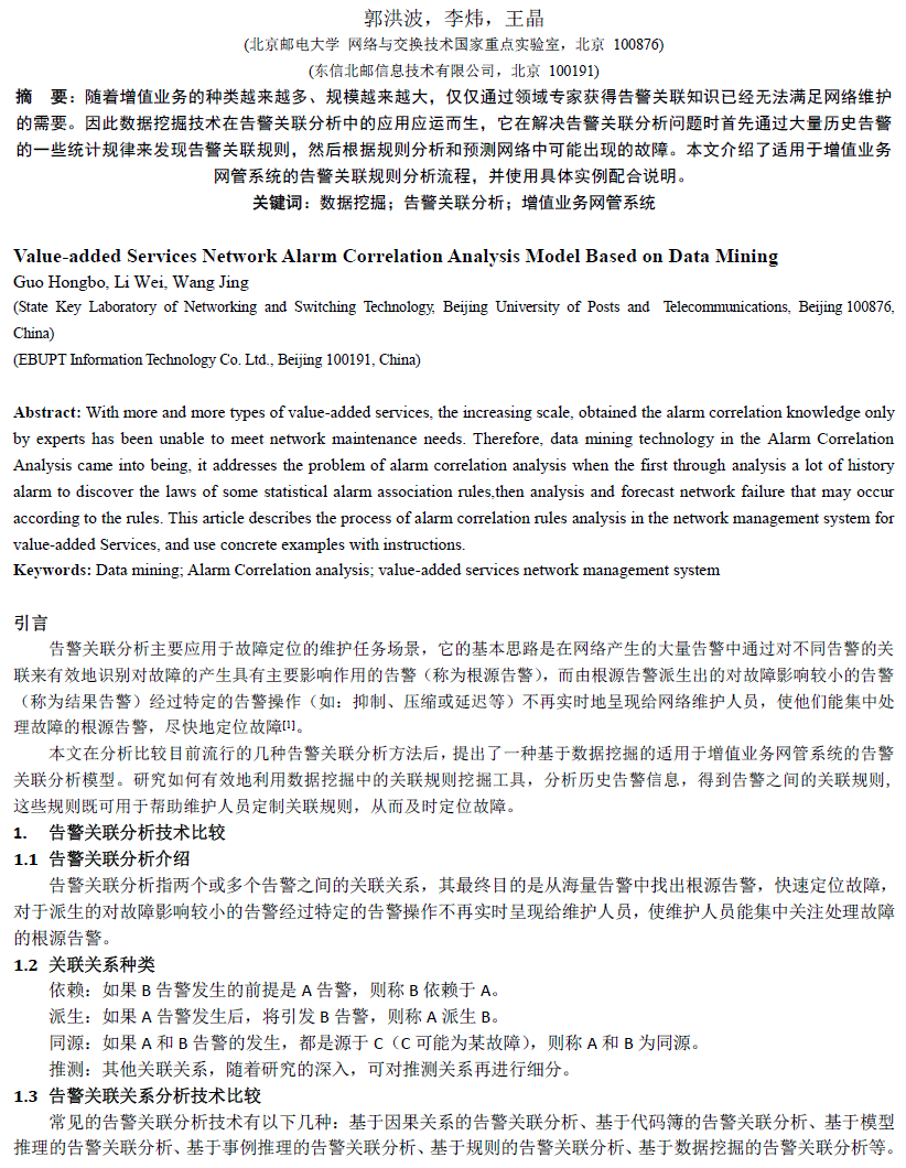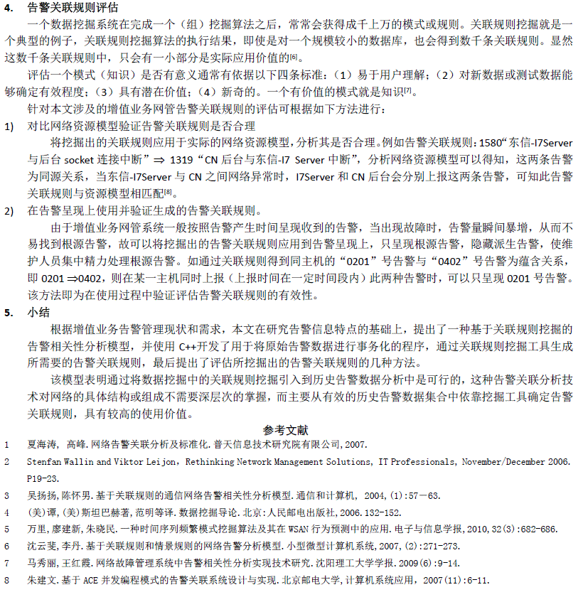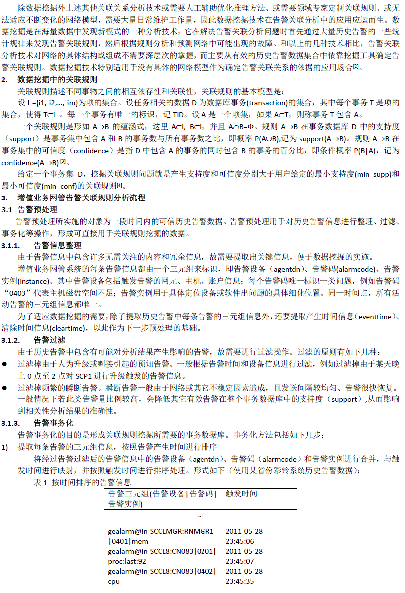 基于数据挖掘的增值业务网管告警关联分析模型 2011-11 《电信工程技术与标准化》