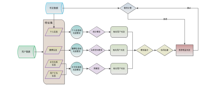 采用这三个模型分别计算用户的相关用户列表,结合模型融合的技术和TOP-N算法得到最终的推荐明星列表。