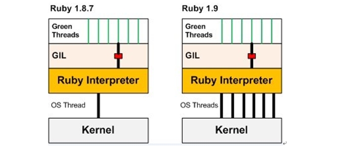 在Ruby1.8版本中,一个Ruby Interpreter仅会被映射到一个操作系统级线程,其多线程是建构在用户态之上的轻量模型,并不能充分利用多核的性能。到了Ruby1.9版本,其多线程模型进行了改进,虽然可以映射到多个本地线程,但由于GIL的存在,同一时刻仍然只能执行一个线程。图1显示了两个版本中Ruby 线程模型的变化。