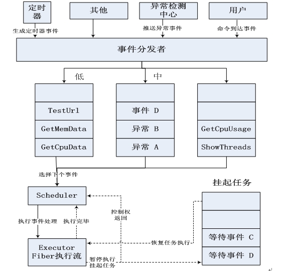 定时器事件:如Web页面检测等例行性任务,需要设定各种定时器,定时器到时就会产生相应事件。事件处理优先级低。