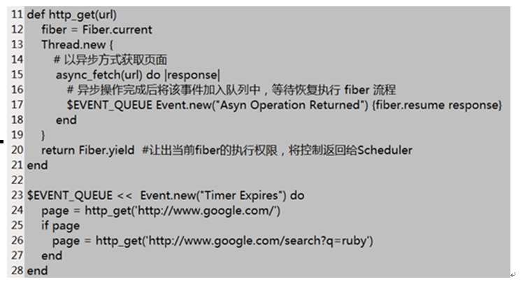 利用Ruby Fiber,通过对异步操作的封装,可以实现伪同步API,将业务逻辑重新聚合,同时并不损失非阻塞IO的性能。图4是一个简单的示例,代码第一次访问google网站查看其是否可用,如果可用,第二次访问google进行检索。通过http_get方法对异步操作的封装,任务执行代码被集中在一个block中,逻辑清晰易懂。