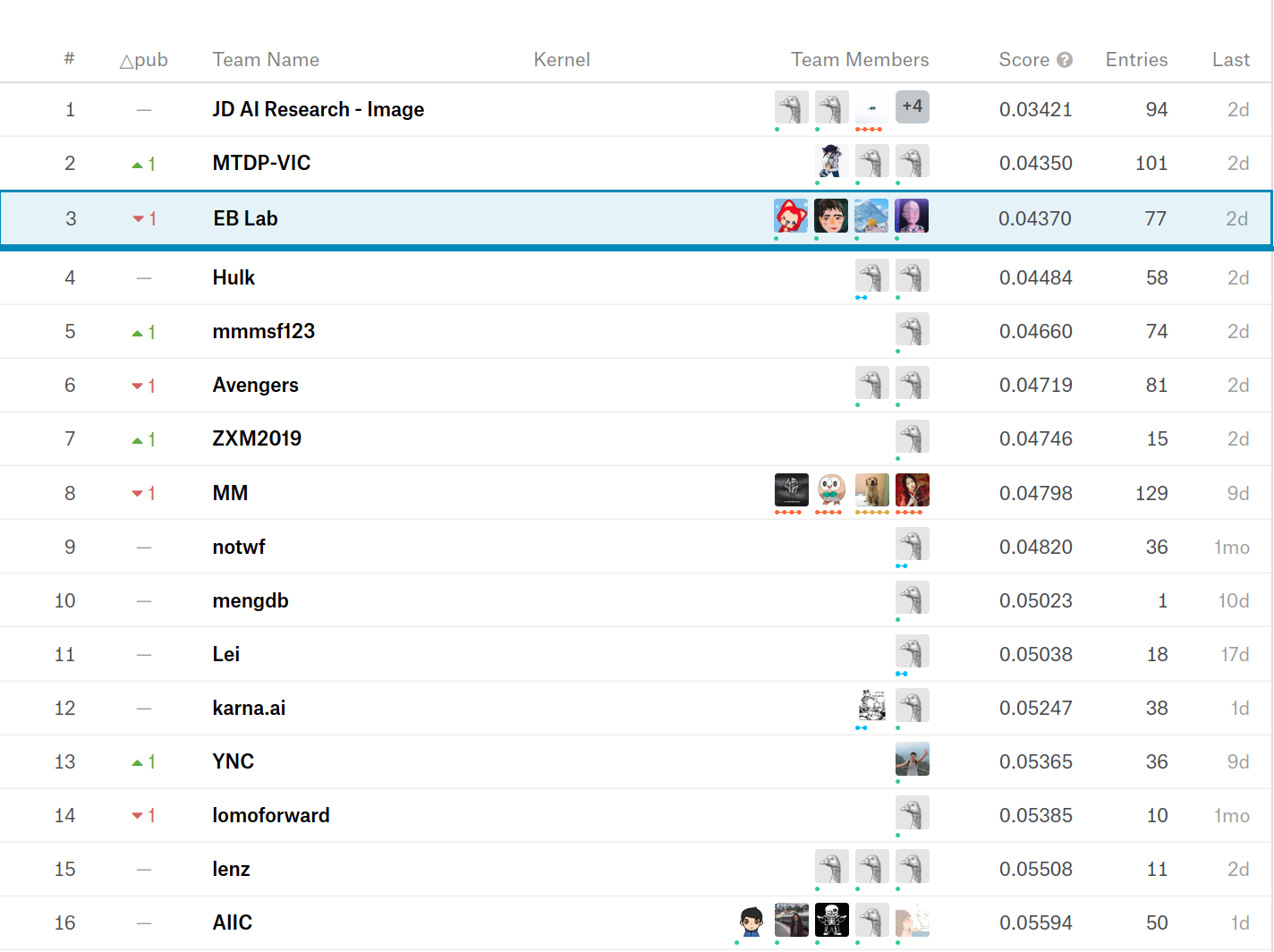 东信北邮EB Lab团队依托于北京邮电大学的学术积累,由王敬宇教授、戚琦和孙海峰三位老师带领,本次参赛iMaterialist由戈策、郝凌轶、马迎新、肖凝组队,通过对多个深度学习网络模型优化,多尺度训练,Model Stacking,标签强关联学习等方法获取识别结果,最终EB Lab脱颖而出,勇夺全球第三名的好成绩,并将在CVPR 2019 会议上做现场分享。
