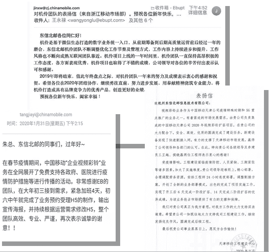 东信北邮积极投入抗疫行动以来,充分发挥自身优势,坚决有效地为运营商和政府提供了通信保障和支持。为此,我们也得到了运营商和政府的高度认可,中国移动政企公司、天津移动、浙江移动等单位纷纷发来了致谢和表扬信。