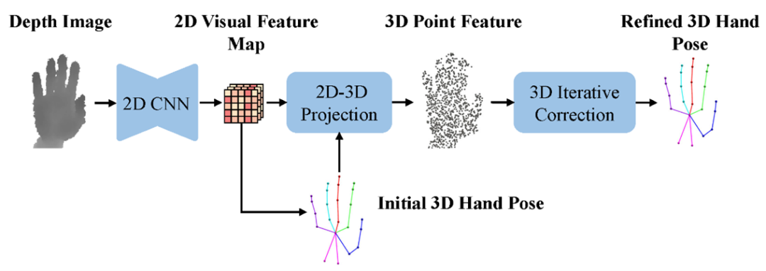 论文简介:本文提出了一种图像点云网络(IPNet)用于精确和鲁棒的三维手部姿态估计。IPNet利用二维CNN高效地在二维图像空间中提取视觉表征,并在三维点云空间中进行迭代校正,挖掘深度数据的三维几何信息。特别地,提出了一种基于稀疏锚点的“聚合-交互-传播”范式来细化点云特征,减少了不规则的数据访问。同时,在迭代修正过程中引入三维手模型先验信息,显著提高了IPNet对遮挡和深度空洞的鲁棒性。