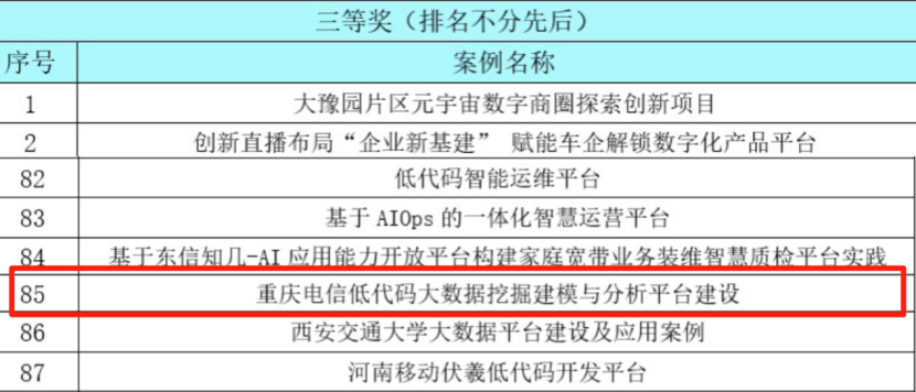 本次大赛以“数字扬帆,鼎新引领”为主题,共收到来自全国31个省、自治区、直辖市的1000余家企业、科研院所等单位的2146个申报案例。经过案例征集、全国入围赛、人气案例评选、全国总决赛等环节的激烈竞争,新讯联合中国电信股份有限公司重庆分公司申报的项目“重庆电信低代码大数据挖掘建模与分析平台建设”突破重围,荣获第二届“鼎新杯”数字化转型应用大赛三等奖!